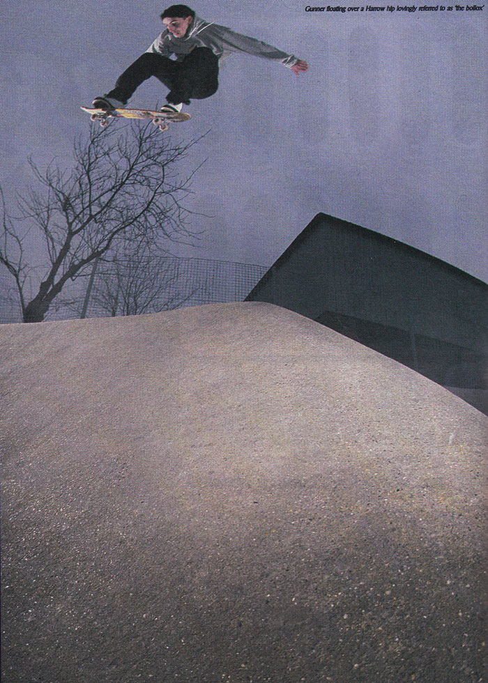 “Moffett and I came to Harrow skatepark at the end of our European tour summer of 91. We arrived in the evening to a sea of crusty concrete. The place was empty and we quickly set up our camp site as the darkness set in. In the morning I woke to find we were sleeping on top of what looked like a peanut shaped pool that had been filled in and was covered in grass. 6 years later I returned to Harrow with Childress, Navs, Brauch & Pete Thompson and the pool had been dug out and was once again skateable. The concrete here has a rich history and when you roll around you can feel the soul of the park”. – Peter Hewitt