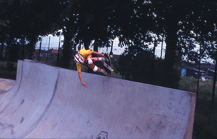 “Woke up in Harrow on a foggy morning in 1992 after the first overseas flight of my life. I was given sketchy directions to the skate park, finally found it behind what looked like to be a school football field. I was truly amazed since I had never been to a real skate park before besides Benicia at the time. Harrow had a real deal pool and a huge “half” pipe and also a four bowl ditch type thing. They were running a skate shop out of a Container and sold little microwavable snacks and stuff, it was like paradise to me!